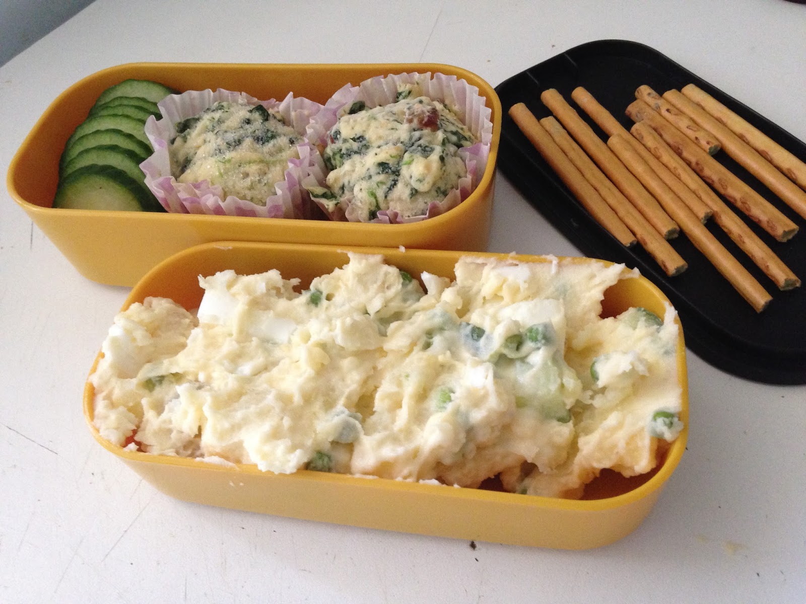 Kisir, Japanese Sweet Potato Muffins, cheese cubes and hot chocolate Pocky sticks.
